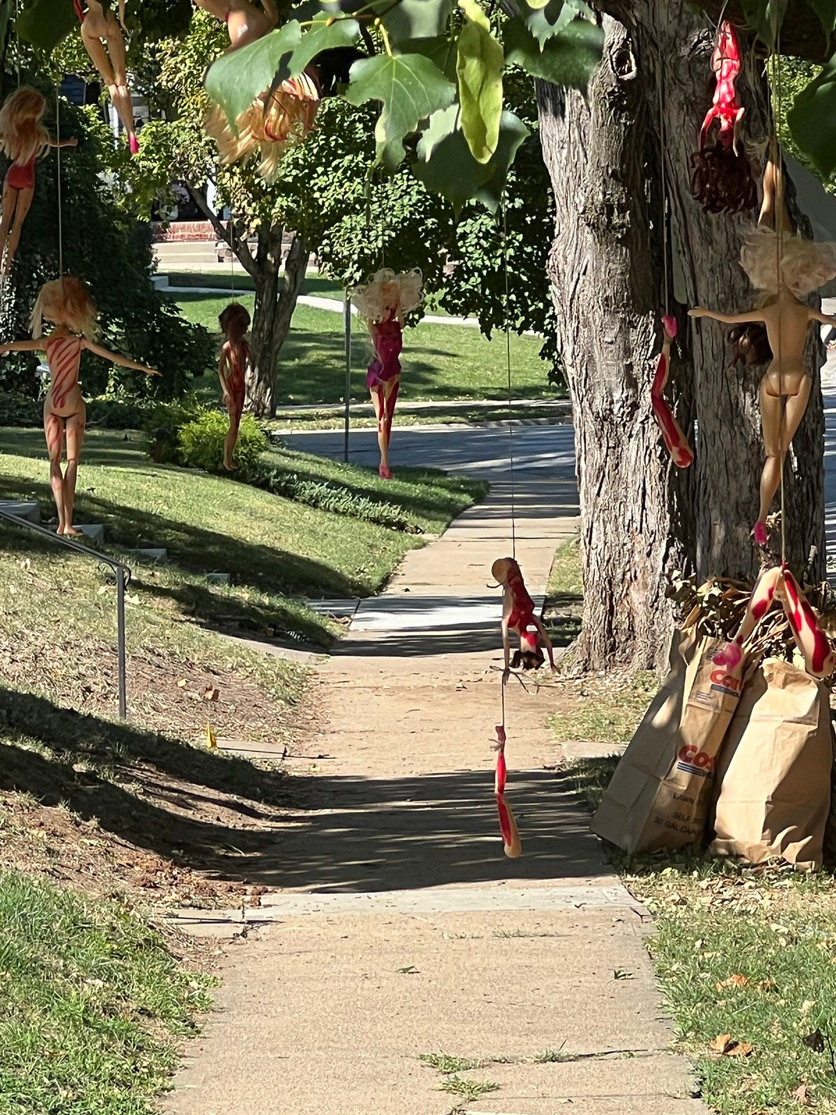 My neighbor across the street hangs a bunch of dead Barbie’s from her tree every year in October for Halloween. It’s unsettling, it’s not my personal favorite thing, but she loves doing it. You do you. We also live a block down from an elementary school and the parents walk their kids past her house. The kids LOVE these dead dolls, their faces light up but it’s clear their parents don’t feel the same way.