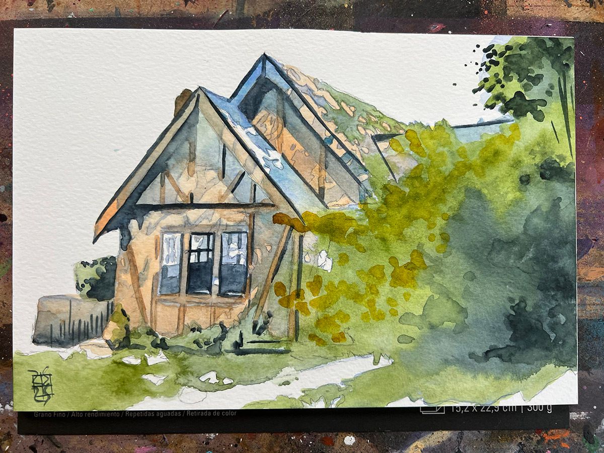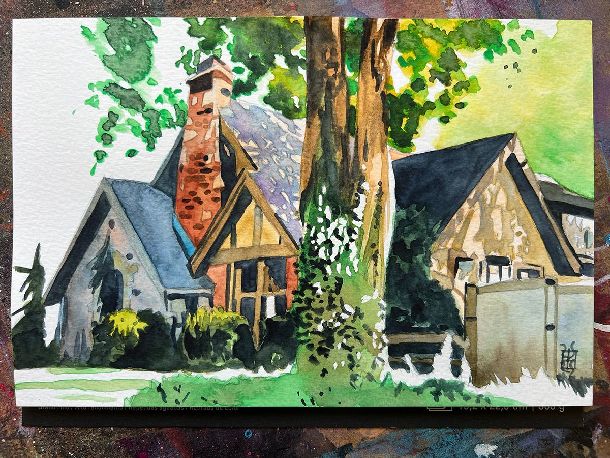 This one has a gorgeous tiled roof but it’s hard to see with all of the lush growth around it, so I made the story of this composition more about the vegetation and the light shining through it as a framing device for the house itself. I didn’t have the highest hopes for this but it turned out pretty nice once I was done.