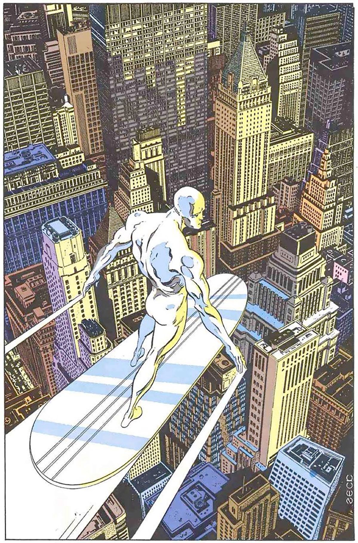 Mike Zeck took that composition even further with this Silver Surfer illustration. The plain white space speaks volumes against that super-detailed city, doesn’t it? I feel like it also speaks to the character’s loneliness in a poignant way.