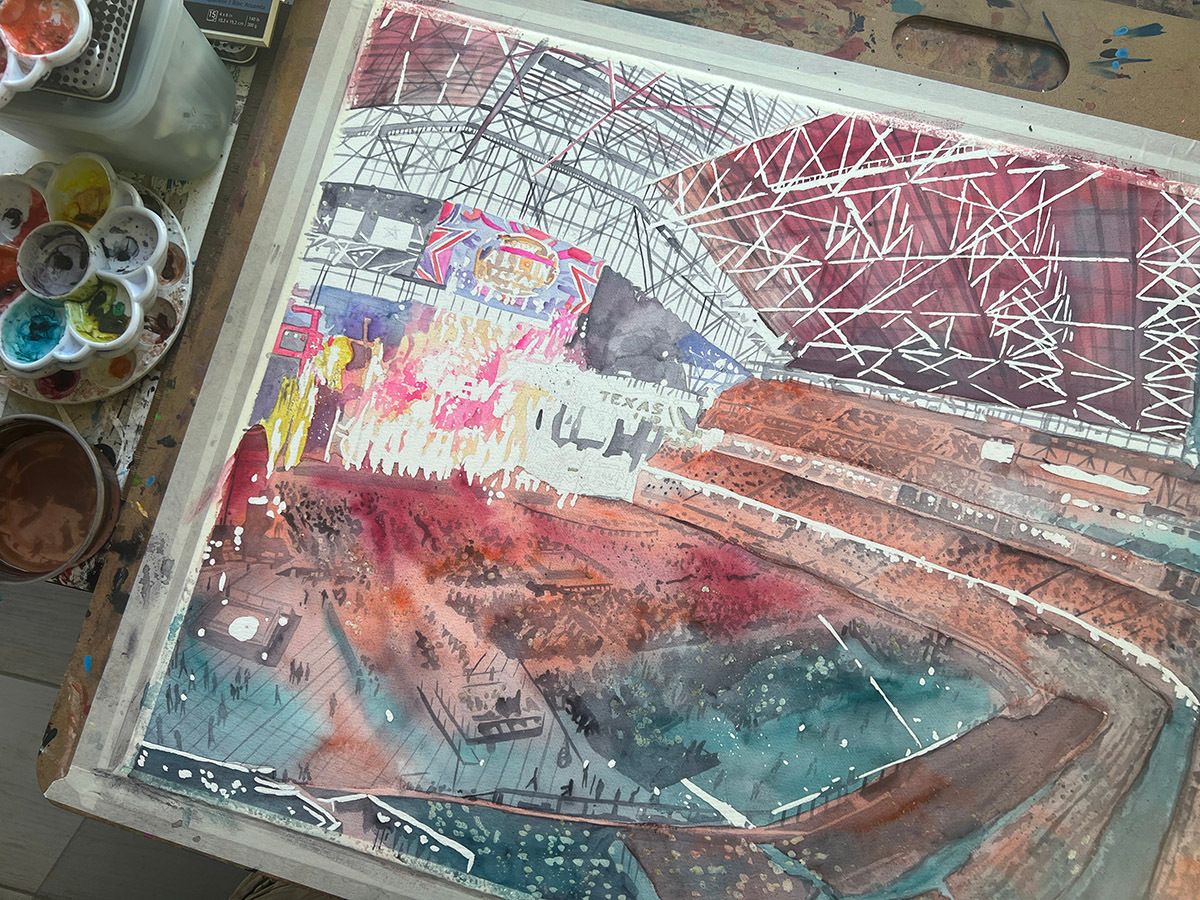 Here’s a progress shot for next week’s All In 2025 Wrestling Landscape painting. More details to come! Like, both about the print and, you know, adding details to the painting. It’s a pun! Laugh along!